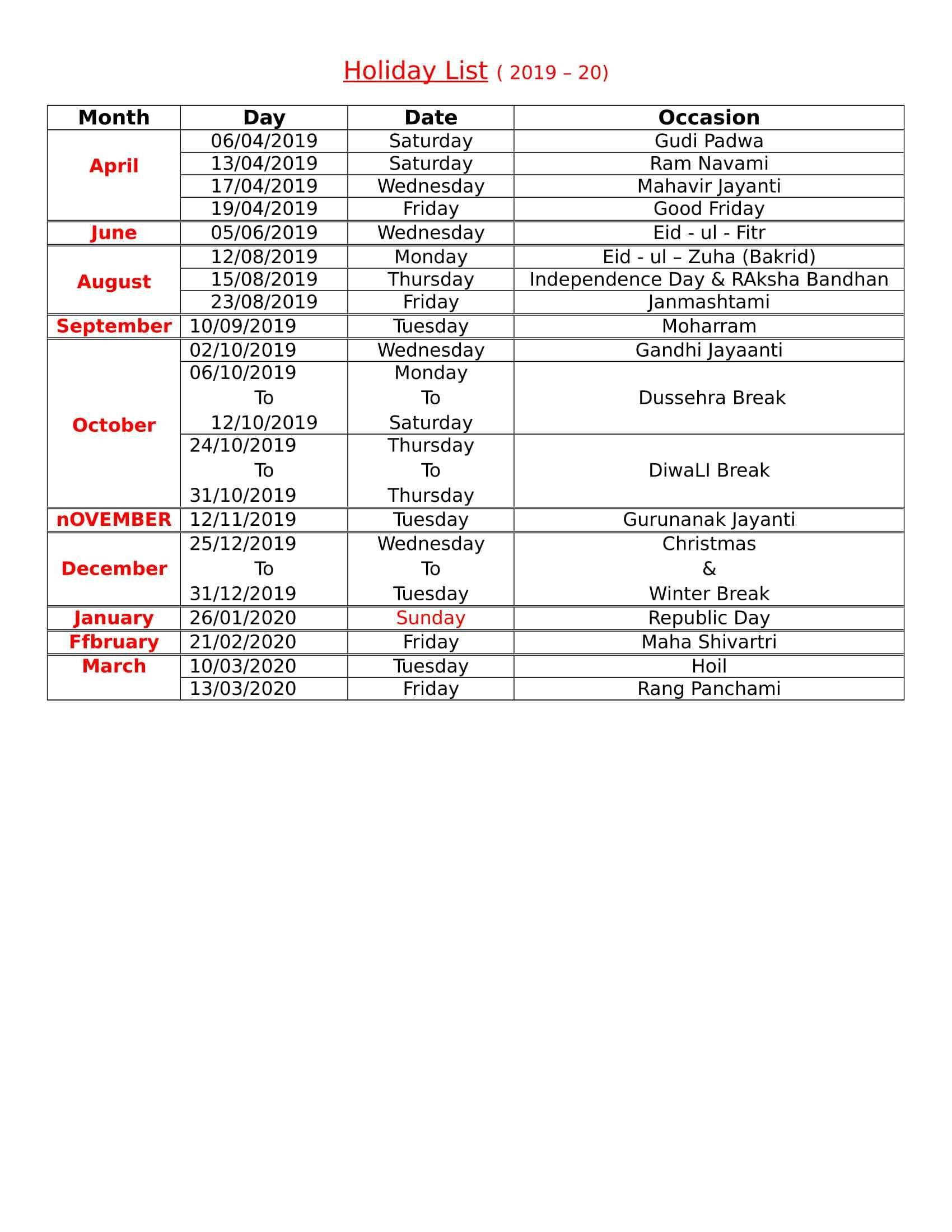 Holiday List